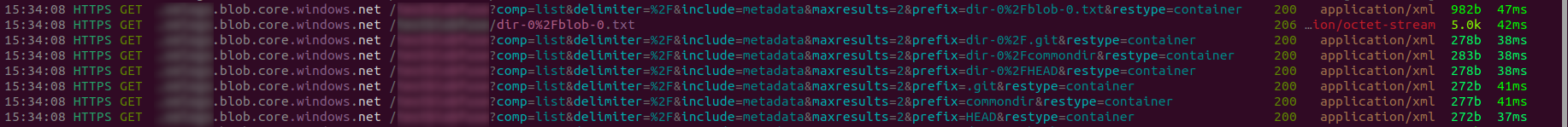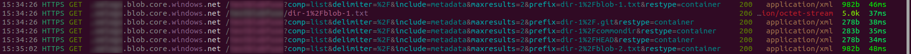 As soon as we hit enter, we should start seeing the API calls being intercepted by mitmproxy. Note that we have not requested any file yet, so all these calls are made by blobfuse2 to list the contents of the container and build its internal cache.